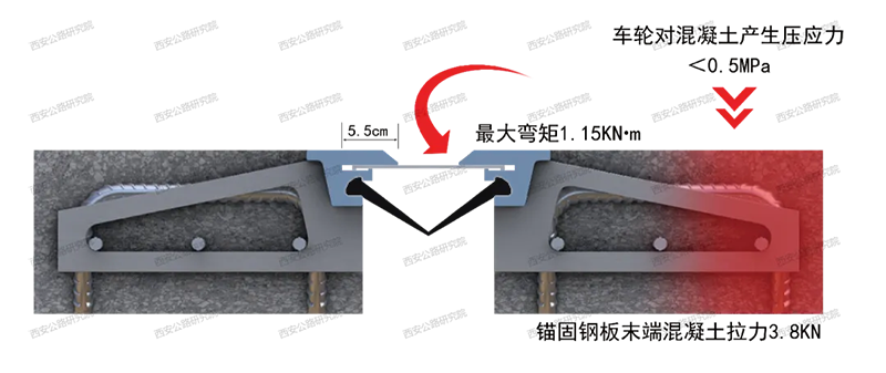 FC型鋼最大懸臂長5.5cm,產(chǎn)生最大彎矩1.15KN·M,錨固鋼板末端混凝土拉力3.8KN,遠(yuǎn)遠(yuǎn)小于混凝土抗拉設(shè)計(jì)強(qiáng)度;車輪對混凝土產(chǎn)生壓應(yīng)力小于0.5mpa。