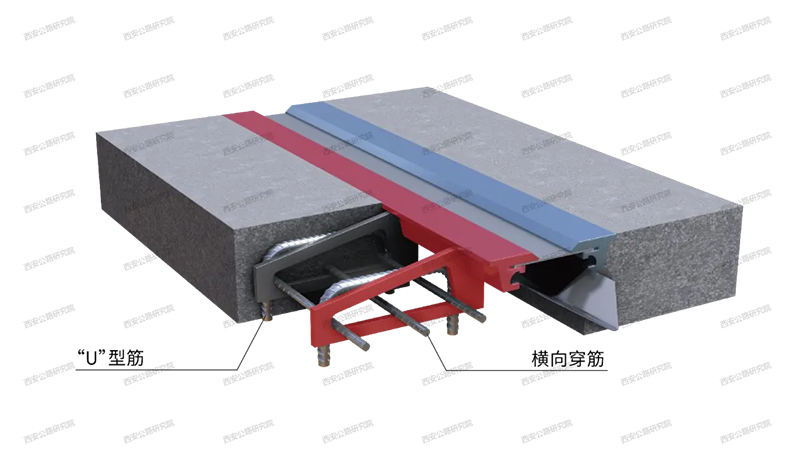 FC型鋼整體軋制成型,與整體切割錨固鋼板焊接,保證了FC型鋼下混凝土出現(xiàn)空洞情況時,伸縮縫能正常工作。橫向穿筋與錨固鋼板形成“井”字連接,并與“U”型筋焊接,經(jīng)混凝土填充,使伸縮縫錨固更可靠。