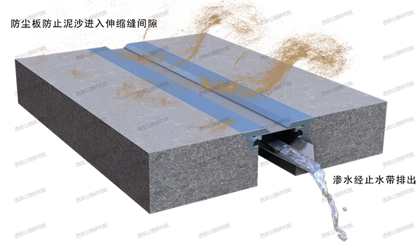 防塵板防止泥沙進(jìn)入伸縮縫間隙,造成止水帶撕裂破壞。防塵板上部分泥沙經(jīng)車輪產(chǎn)生風(fēng)力吹出,剩余的泥沙隨雨水沿橋橫坡方向排出,沿防塵板縫隙下滲的水經(jīng)止水帶排出,無需專門養(yǎng)護(hù)。