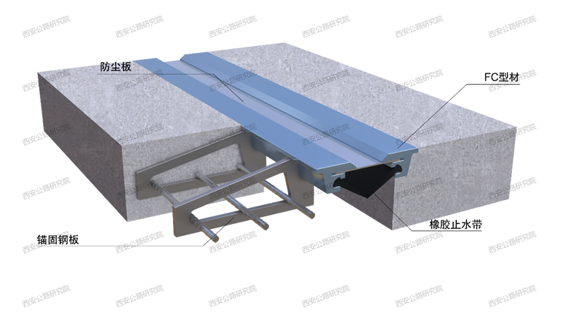 西安公路研究院科創(chuàng)中心研發(fā)的一款耐久性防塵滑板伸縮裝置,由FC型鋼、防塵板、錨固鋼板和橡膠止水帶組成。