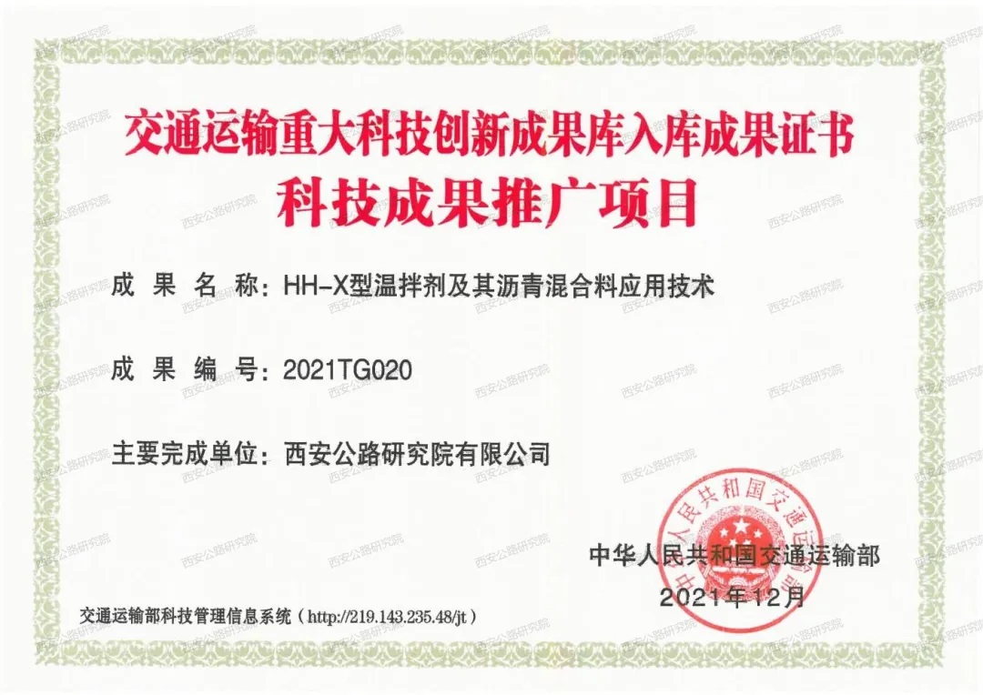 《HH-X 型溫拌劑及其瀝青混合料應(yīng)用技術(shù)》(成果編號(hào):2021TG020)入選交通運(yùn)輸重大科技創(chuàng)新成果庫(kù)(科技成果推廣項(xiàng)目)。