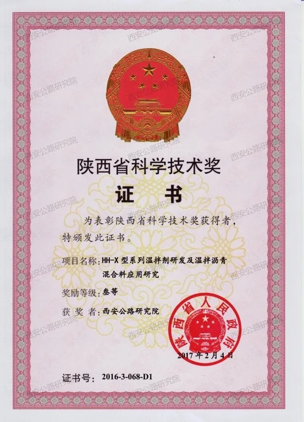 HH-X系列瀝青溫拌劑是西安公路研究院有限公司開(kāi)展的陜西省交通科技項(xiàng)目《乳化型溫拌混合料添加劑研發(fā)及應(yīng)用研究》(編號(hào)10-28K)和《HH-X型溫拌劑推廣應(yīng)用研究》(編號(hào)13-32T)的研究成果。該系列產(chǎn)品在不降低原有瀝青及混合料性能的情況下,能夠顯著提高瀝青混合料的和易性,有效降低瀝青混合料的生產(chǎn)和施工溫度,解決瀝青混合料在低溫環(huán)境下攤鋪、壓實(shí)問(wèn)題,延長(zhǎng)施工季節(jié),改善瀝青路面施工環(huán)境。