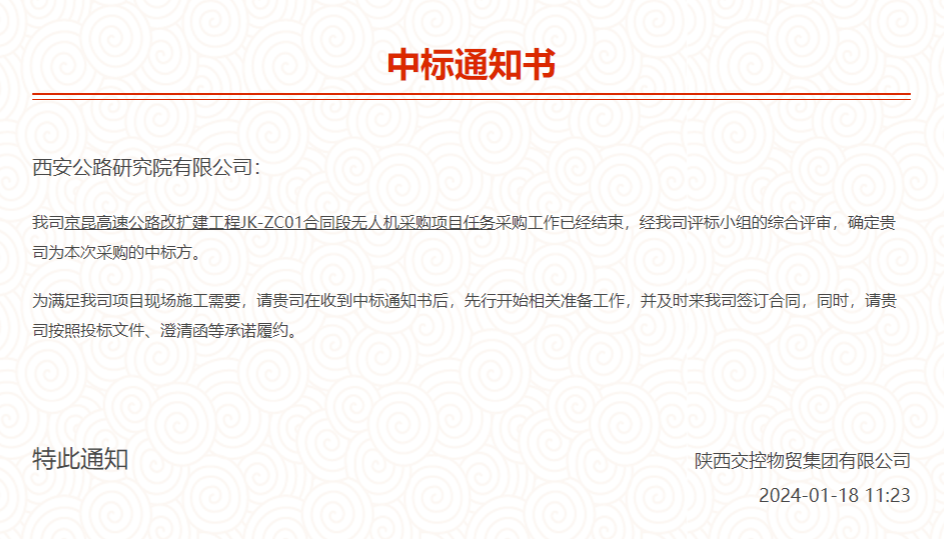 近日,工程勘察院交通工程設(shè)計(jì)研究所成功中標(biāo)京昆高速公路改擴(kuò)建工程JK-ZC01合同段無人機(jī)智慧巡檢項(xiàng)目,中標(biāo)金額217.124萬元。