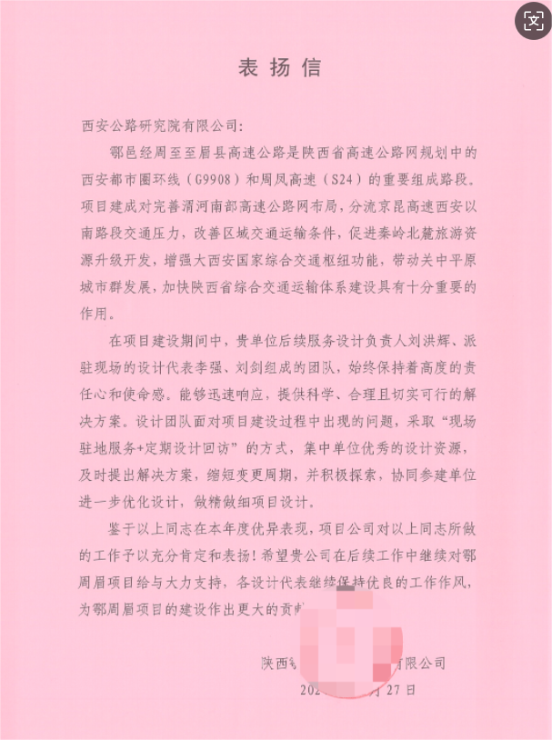 歲末年初,西安公路研究院收到陜西鄠周眉高速公路有限公司表?yè)P(yáng)信,對(duì)西安公路研究院勘察設(shè)計(jì)所鄠周眉高速公路HM-SJ02標(biāo)后續(xù)服務(wù)設(shè)計(jì)團(tuán)隊(duì)在2024年鄠周眉高速建設(shè)過(guò)程中展現(xiàn)出的專(zhuān)業(yè)水平、服務(wù)態(tài)度及高度的責(zé)任感給予充分肯定,對(duì)設(shè)計(jì)負(fù)責(zé)人劉洪輝、派駐現(xiàn)場(chǎng)設(shè)計(jì)代表李強(qiáng)、劉劍三位同志給予表?yè)P(yáng)。