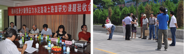 7月7日,陜西省交通運輸廳在銅川主持召開了由西安公路研究院等單位承擔(dān)的《融冰抗滑少縫預(yù)應(yīng)力水泥混凝土路面研究》課題驗收會。陜西省交通運輸廳、西安公路研究院、長安大學(xué)、陜西省公路局和陜西省銅川公路管理局等單位的代表和驗收委員會專家一同考察了試驗路段、聽取了課題組組長張東省的匯報、審閱了相關(guān)技術(shù)資料,驗收委員會一致同意通過驗收并給予了很高的評價,該課題研究內(nèi)容分為兩部分,子課題(一)《斜向后張法預(yù)應(yīng)力混凝土路面技術(shù)研究》研究成果總體達到國際先進水平,子課題(二)《水泥混凝土路面電磁融雪技術(shù)研究》研究成果總體達到國內(nèi)領(lǐng)先水平。課題創(chuàng)新點突出,在國內(nèi)外首次提出了斜向后張法預(yù)應(yīng)力水泥混凝土路面的理念、設(shè)計理論和方法,首次成功鋪筑了100米無縫斜向后張法預(yù)應(yīng)力水泥混凝土路面試驗段,完善了相應(yīng)的施工工藝,并編制了設(shè)計施工指南。該試驗路經(jīng)過一冬一夏的車輛運行考驗,路面無裂縫、平整且行車舒適。另外,課題組研發(fā)了水泥混凝土路面電磁能融雪技術(shù),完善了電磁能融雪水泥混凝土路面施工工藝,成功鋪筑試驗段200米,經(jīng)去年冬天兩次降雪檢驗,試驗路段融雪效果好。