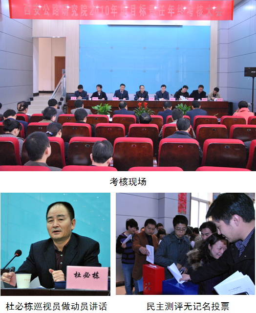 考核會(huì)議在報(bào)告廳進(jìn)行。杜必棟巡視員做考核動(dòng)員講話,他指出,2010年既是十一五收官之年,又是十二五開局之年,省交通運(yùn)輸廳考核組將根據(jù)《省交通運(yùn)輸系統(tǒng)年度目標(biāo)責(zé)任考核暨領(lǐng)導(dǎo)班子和領(lǐng)導(dǎo)干部考核評(píng)價(jià)試行辦法》及年度目標(biāo)責(zé)任書,對(duì)各種情況進(jìn)行考核摸底,要高度重視本次考核、注重考核實(shí)效,為省廳2011年交通運(yùn)輸工作會(huì)議做準(zhǔn)備。他要求中層干部及職工代表積極配合,加強(qiáng)監(jiān)督,做到公平公正。院黨委書記胡興民同志代表院領(lǐng)導(dǎo)班子匯報(bào)了研究院一年以來生產(chǎn)經(jīng)營(yíng)、對(duì)外交流、黨風(fēng)廉政、精神文明、面臨的問題和矛盾及2011年工作安排等各方面工作進(jìn)展情況,院領(lǐng)導(dǎo)班子成員、中層干部及職工代表參加了會(huì)議。