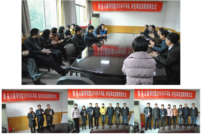 12月22日上午,西安公路研究院2010年乒乓球、羽毛球友誼賽頒獎儀式在院內(nèi)舉行。儀式由工會主席方立團(tuán)主持,院長張東省、黨委書記胡興民、總工張惠山、副院長張斌、紀(jì)委書記王龍順、副院長袁卓亞出席了頒獎儀式并為獲獎?wù)哳C發(fā)了獎杯。
